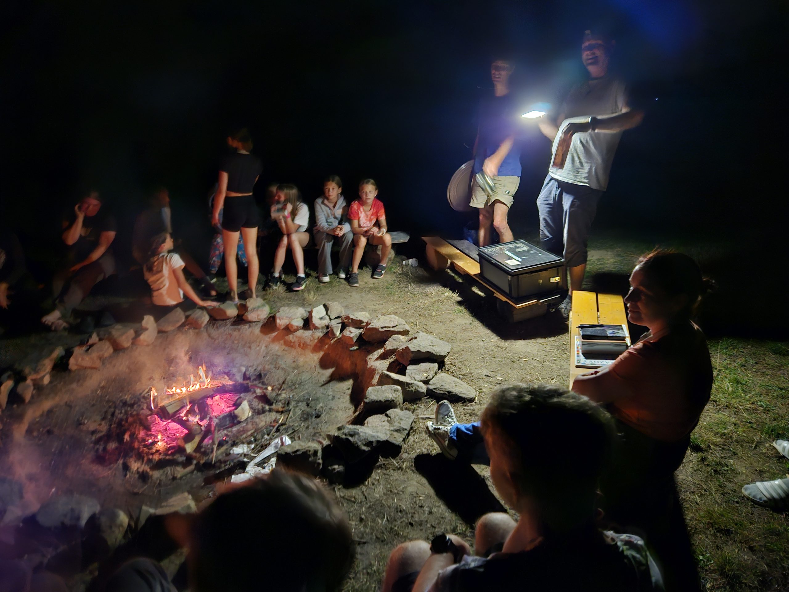 Vrátili jsme se po cestě zpátky to tábora, rozdali zpět vybrané baterky a telefony a poslali malé dětičky rovnou spát. Velké dětičky a vedoucí poseděli ještě u táboráku a pak už se postupně začali taky trousit do hajan. Bylo taky pozdě – vrátili jsme se až okolo půlnoci.