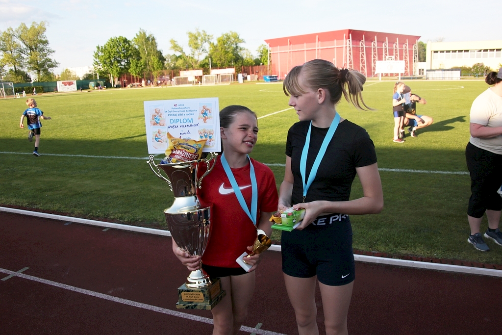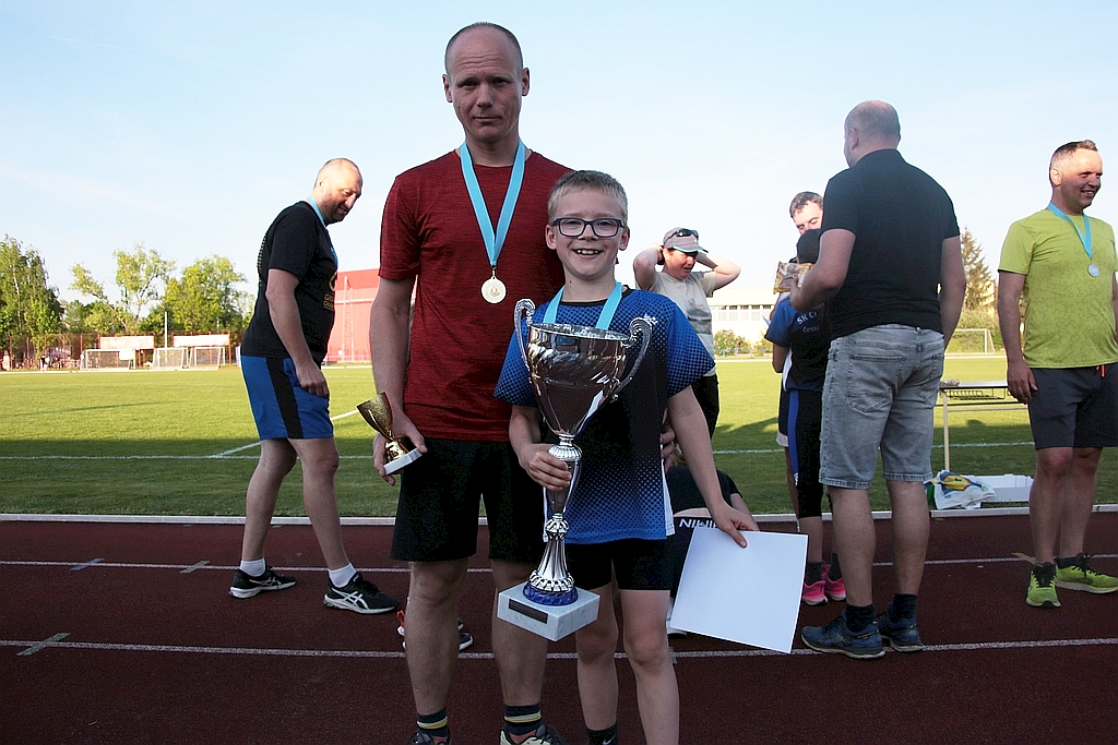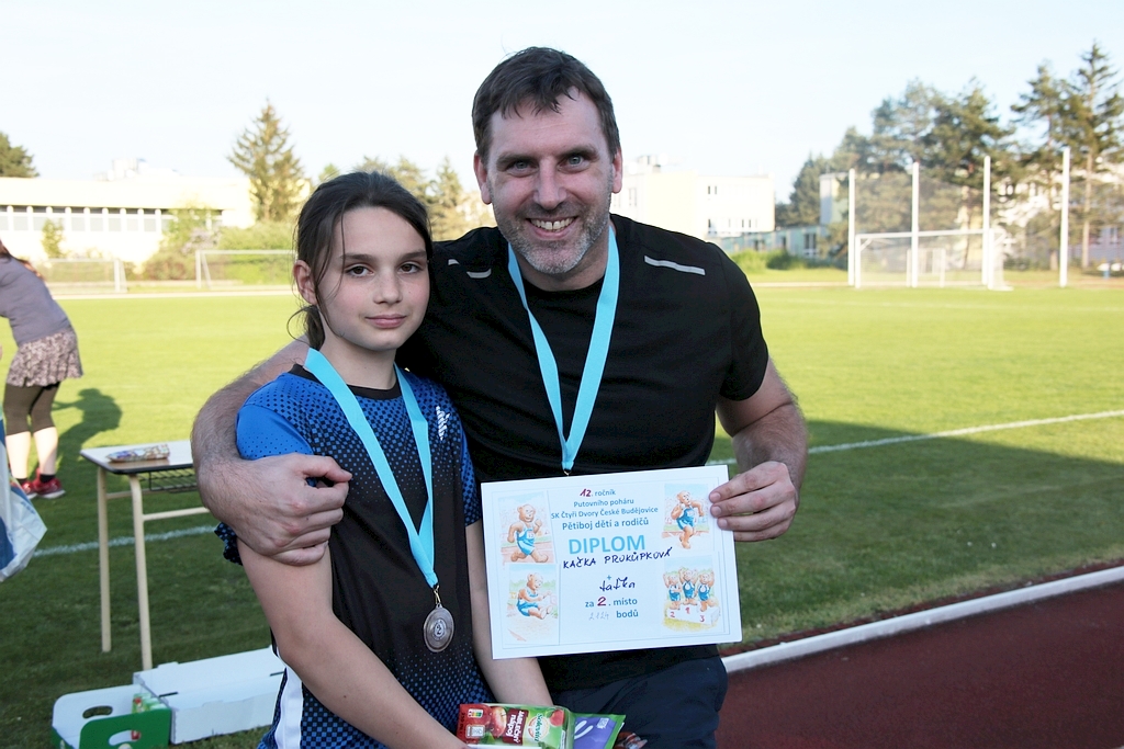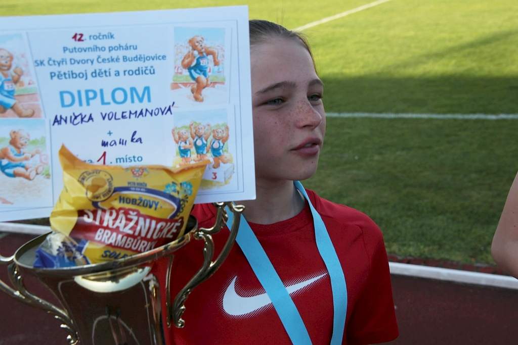 Podvanácté jsme se sešli na tradičním pětiboji rodinných týmů o putovní poháry. V obou kategoriích přípravky bylo sedm týmů skládajících se z dětí, které chtěly předvést rodičům své atletické dovednosti, a rodičů, kteří se snažili předvést dětem, že taky něco dokáží. Viděli jsme pěkné výkony dětí i rodičů, zvláště v technických disciplínách skoku dalekého a hodu medicinbalem.V mladší přípravce docela těsně vyhrálo duo Lukáš Plšek + taťka o pouhých 74 bodů před Honzíkem Pečlem s taťkou a Míšou Jakubíkovou s taťkou.Naopak starší přípravku vyhrál silně favorizovaný tým Anička Volemanová s mamkou s velkým bodovým náskokem před Kačkou Prokůpkovou a Anežkou Mračkovou.S potěšením konstatujeme, že poprvé vyhrál tým s maminkou, ale s politováním musíme také říci, že ta vítězná maminka se zranila při doběhu 600 m. A aby té smůly nebylo málo, jeden tatínek si také natáhl sval na štafetě 2x50 m. Oběma jim přejeme rychlé uzdravení a ostatním rodičům, ať je brzy přestanou bolet nohy. Výsledky jsou